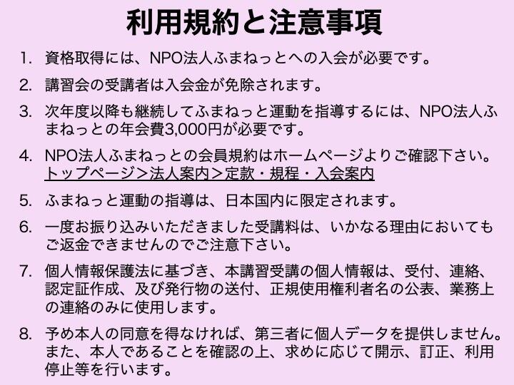 ・本講習最後の認定試験に合格し、認定NPO法人ふまねっとの正会員に入会することでふまねっと運動を指導する権利が得られます。(入会金無料・翌年度分より年会費3,000円、4月から資格有効とするためには3月末までのお支払いが必要となります。)